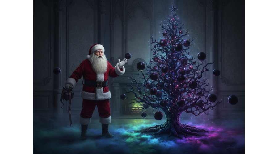 Dans le grand bureau du Père Noël, les boules de Noël flottaient dans les airs comme des étoiles apprivoisées. Certaines reposaient aussi sur les branches du grand sapin, mais la plupart étaient suspendues par magie autour de lui - comme les bougies de Poudlard - créant une constellation lumineuse et mouvante.